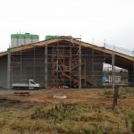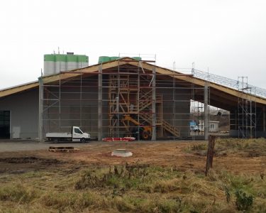 Wegen der hohen Ansprüche an Düngerlagerhallen sind die aufgehenden Wände in Stahlbetonfertigteilbau erstellt und mit einer Beschichtung versehen. Das weitspannende Dachtragwerk wurde zimmermannsmäßig als Ingenieurholzbau errichtet. Besonderes Highlight ist der unter Dach liegende Treppenturm, der traditionell örtlich gerichtet wurde. Alle Stahlbauteile sind in Edelstahl ausgeführt. Wir haben das Projekt geplant und gebaut.
